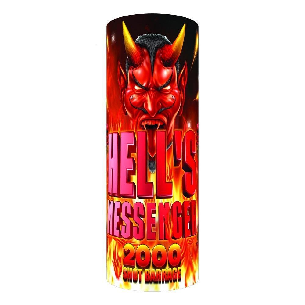 2232 HELLS MESSENGER 2000-SHOT BARRAGE: EFFECTS: (A) Red, green, white, blue, crackling. (B) Silver chrysanthemum. (C) Peony burst with silver tail with red, green, gold, blue and white crackling peony.