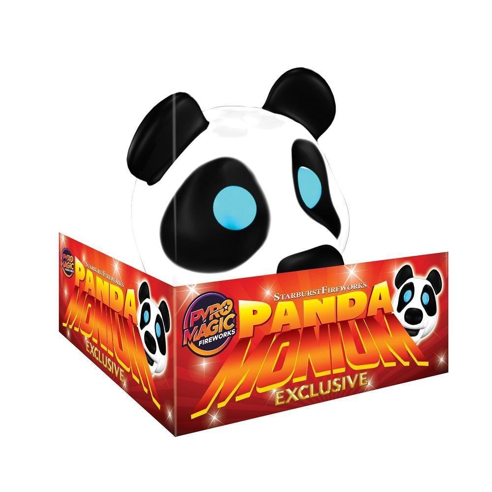Panda Monium Firework. Watch how the Panda’s eyes twinkle on this amazing long duration fountain. Effect include a whistle, silver & ornage crackles with blue stars. Red chrysanthemum and silve crackling with blue stars. Red plum and silver crackling with blue stars and white strobes.