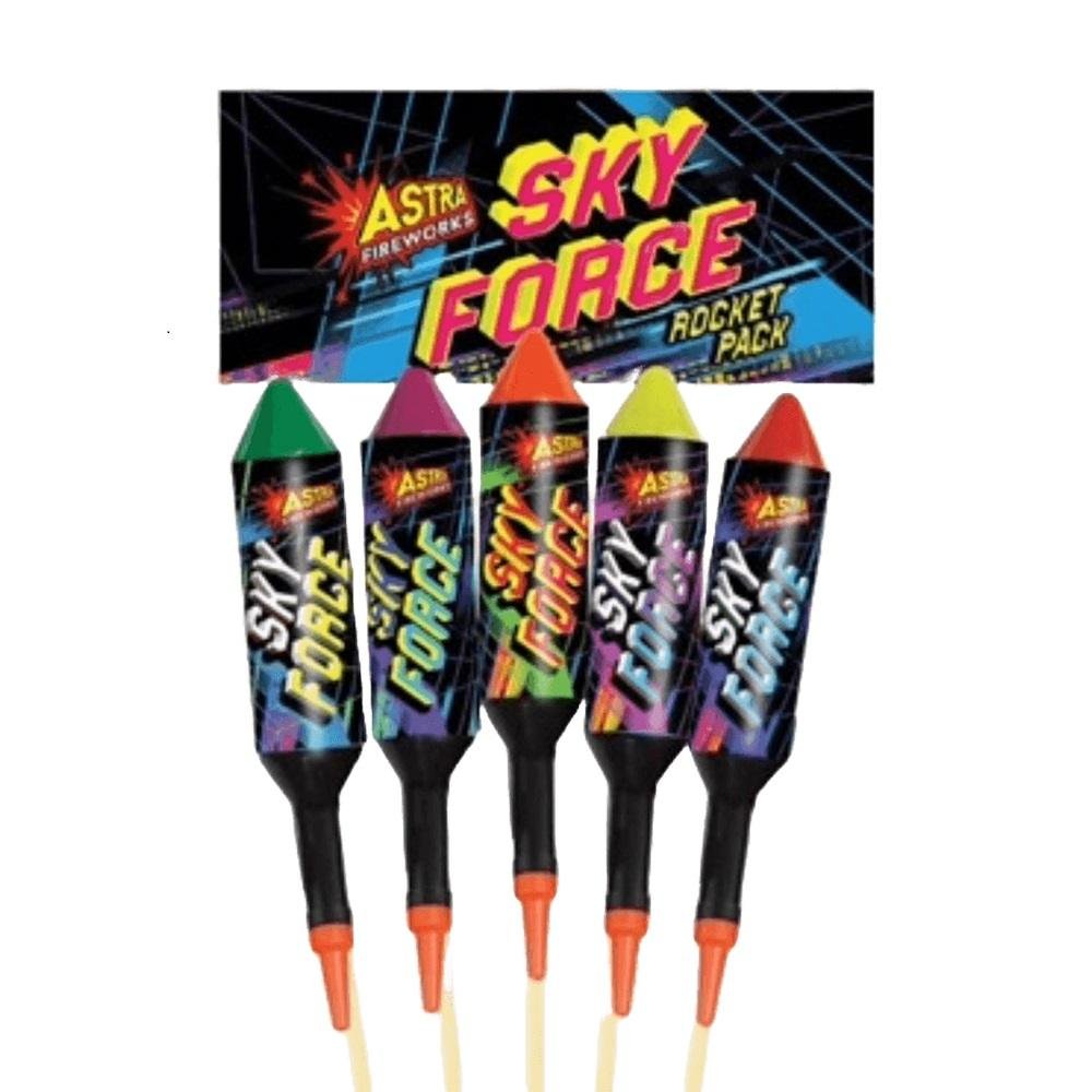 A 5 rocket pack with bursts golden willow burst with purple or crackling stars, golden brocade effects with blue, red or green stars.