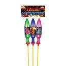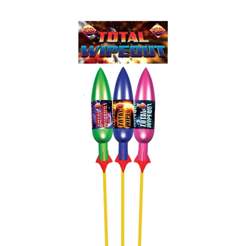 2314 TOTAL WIPEOUT ROCKETS 3 Rockets to a PVC Bag & Header. 8 Packs to a carton EFFECTS: (A) Red palm with chrysanthemum. (B) Brocade to blue with silver glitter. (C) Silver glitter king.